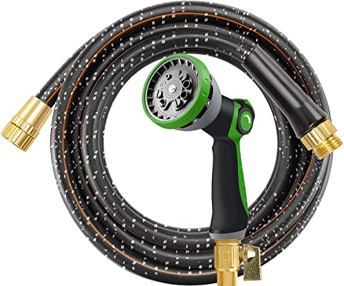 The garden hose comes with a 10 adjustable function spraying nozzle that is more durable than average brittle nozzles. It features an ergonomic rubberized handle and a lockable trigger clip to facilitate stress-free watering for extended periods of time. The rotating bezel allows you to choose from 10 spray functions, meeting all your watering and washing needs. This garden hose is great for outdoor garden, yard, patio, lawn watering, car, house, windows, roof washing, garage, pet cleaning and more.