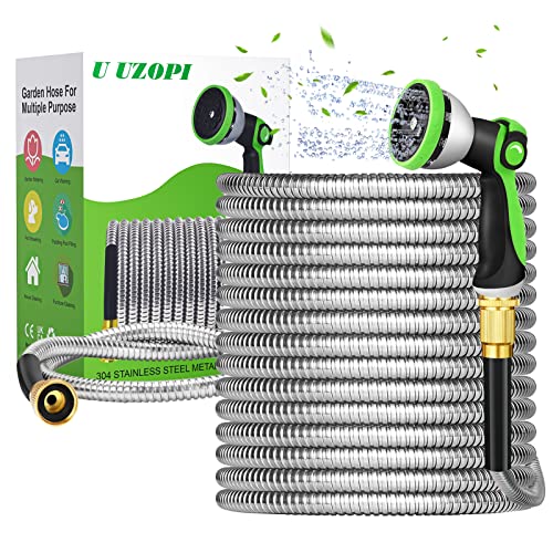 Introducing the effortless coiling and storage 100ft garden hose from U UZOPI, designed with advanced spiral interlocking technology that prevents the hose from kinking or bending during use. This metal hose is incredibly flexible and easy to wind into compact coils, making storage a breeze, and keeping your outdoor space clean and organized.