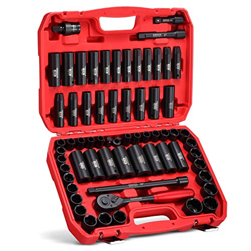 The set comes complete with a heavy toolbox, making it convenient for storage and easy to carry. Included in the set are 1/2" drive 15 x metric sockets, 15 x deep sockets, 14 x SAE sockets, and 14 x deep SAE sockets. You also get 3", 6", and 10" drive impact extension bars, 2 x 1/2" universal joints, and a ratchet handle. The workmanship of this set exceeds the ASME and ANSI standards, so you can be confident in its quality and durability.