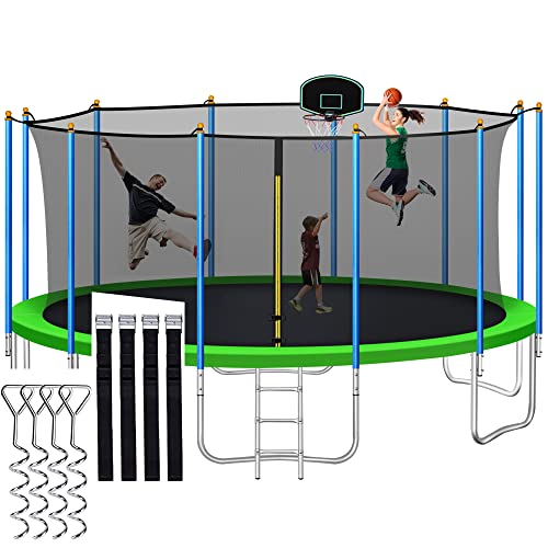 The product is ideal for outdoor fun and exercise for both kids and adults with safety enclosure, basketball hoop, and heavy-duty spring cover padding.