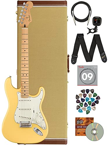 This product bundle is ideal for guitar players and includes accessories such as a case, cable, tuner, strap, strings, picks, and DVD.