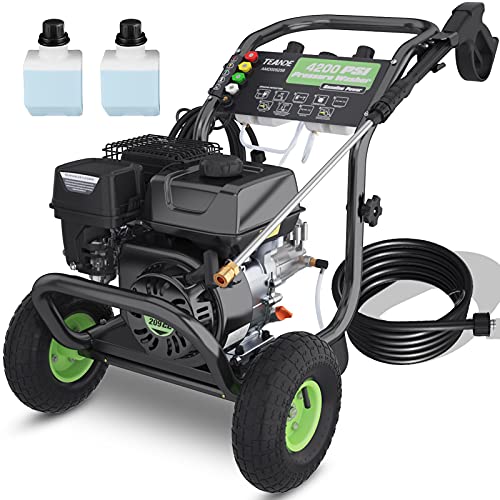 The TEANDE gas pressure washer is ideal for high-performance cleaning with adjustable nozzles, dual soap tank, and a powerful engine.