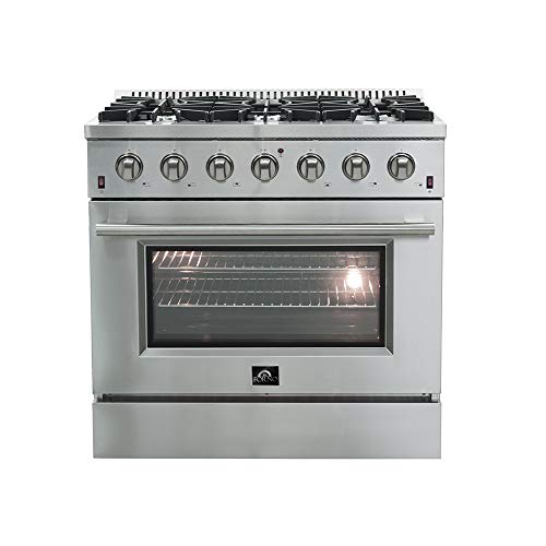 The Forno Alta Qualita 36" gas range is made from 430-grade stainless steel and features 7 heavy-duty cast zinc knobs and light temperature indicators. The thick durable FORNO Easy Clean pro-style handle door with a large viewing window, adjustable stainless steel legs, soft door close, and smudge-resistant finish all add to the overall convenience of the gas range. The range can be converted from natural gas to LP, thanks to the included LP conversion kit.