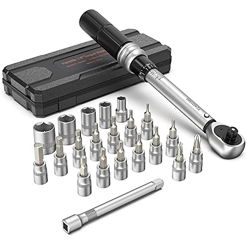 This torque wrench set includes 21 pieces of bike tool kit components, including Hex: H2, H2.5, H3, H4, H5, H6, H8; Torx: T10, T15, T20, T25, T27, T30; PH Bits: PH1, PH2; 5 Sockets: 6-8-10-12-14mm, 1*1/4" extension bar for reaching concealed bolts. The protective molded case ensures safe storage of adjustable torque wrenches and tool bits. The professionally made reversible 45-tooth ratchet head measures torque in clockwise and counterclockwise directions, and it has an engage and release bit installment button.