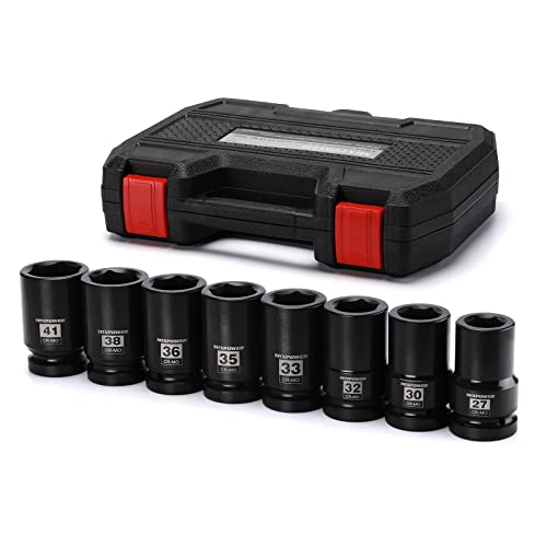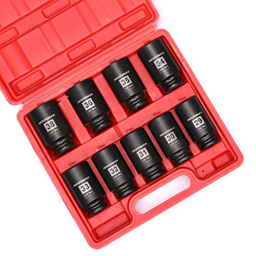 The set includes 8 pieces of 1-inch deep impact sockets, ranging from 27mm to 41mm. Its radius corner design and 6-point opening make it easy to install, dismantle, and repair wheel or axle nuts on vehicles. This design also reduces wear and increases torque on fasteners by placing force on fastener walls instead of fastener corners.