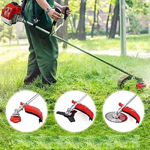 In addition to the multiple cutting heads, this trimmer comes with an extra start pull rope, an extra spark plug for replacement, a plastic mixing bottle for fuel, a shoulder strap for balance, a safety guard for protection, a tool kit for installation, and a product manual. This comprehensive package ensures that you have everything you need to get the job done right.