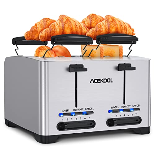 The ACEKOOL 4-Slice Stainless Steel Toaster is a perfect solution for those who want to prepare breakfast for the whole family efficiently. With four slots and dual independent control panels, it allows users to heat up to four slices of bread at once, and the humanized design avoids wasting electricity when only one or two pieces of bread are needed. This toaster is suitable for a variety of bread types, including toast, Texas toast, muffin, waffle, bagel, and more.