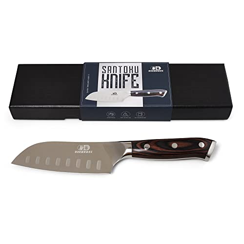 Crafted from premium grade 7Cr17MOV high carbon stainless steel, this Japanese Santoku knife is designed to maintain its sharpness and strength, unlike cheaply made competitors' knives that quickly experience broken tips, dullness, and blade weakness. The handle is made of Pakkawood, a mixture of wooden veneer and resins that is both tough and long-lasting. These materials are also super easy to clean, making maintenance a breeze.