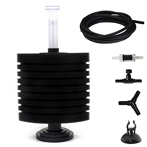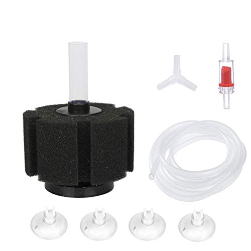 Suitable for tanks up to 75 gallons in size, this sponge filter boasts a dimension of 6.3" D X 7.9"H. It comes complete with a range of handy accessories, including 1 Pcs Sponge Filter, 1 Piece of 4 Feet Black Standard 3/16" Airline Tubing, 1 Pcs Aquarium Air Control Valve, 1 Pcs Check Valve, 1 Pcs Suction Cup, and 1 Pcs Y-shaped Connector.