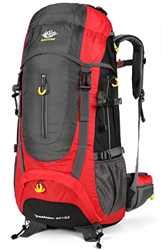 Ideal for hiking, backpacking, and camping with a 65L capacity, waterproof design, and included rain cover.