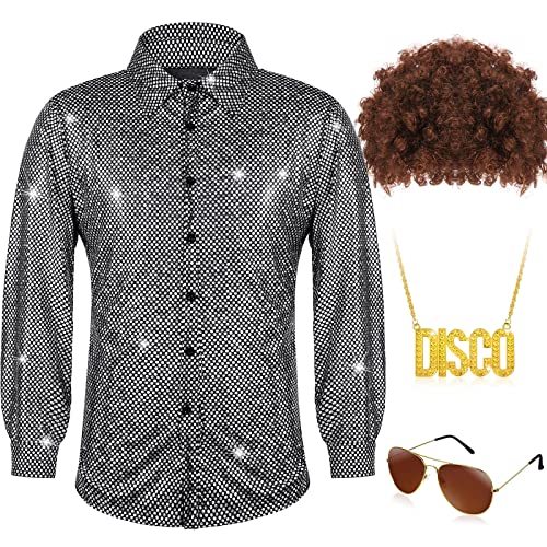 This 5-piece set is the perfect choice for those who want to stand out at any disco-themed party or celebration. It includes a shiny sequin shirt, a funky Afro wig, stylish gold sunglasses, a fake beard, and a gold necklace, all of which are designed to give you an eye-catching and glamorous look.