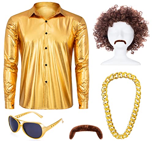 The shirt is made of high-quality gold print polyester material that glimmers and shines beautifully under any light. Along with the wig, necklace, and sunglasses, it makes for an excellent disco costume that is sure to make you the center of attention.