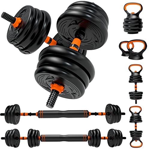This set comes with removable dumbbell pieces that allow for a weight range of 6 pounds to 25 pounds, making it perfect for different stages of exercise intensity. The set includes weight plates (2.5+4.5+5.5) lbs *4, dumbbell handles *2, barbell connecting *1, kettlebell base rod *1, dumbbell bar *2, and spinlock collars *4.