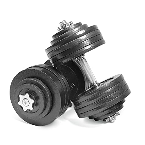 The adjustable dumbbell set from this brand is an excellent choice for anyone looking to exercise from home, office, or gym. It comes with 1x Connecting Rod, 4×2.0KG Dumbbell plates, 4×1.5KG Dumbbell plates, and 4x 1.25KG Dumbbell plates, providing a total weight of 44 pounds.