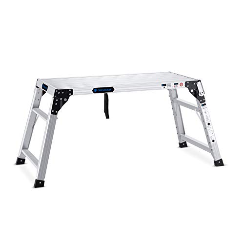 The ORIENTOOLS Work Platform is a solid and lightweight piece of equipment designed to make heavy work easier. Its large work platform measures 39.37 inches by 18.5 inches and is constructed from strong aircraft-grade aluminum. It can hold up to 330 pounds and is equipped with non-marring rubber feet that are safe to use on concrete, wood, asphalt, or bare ground.