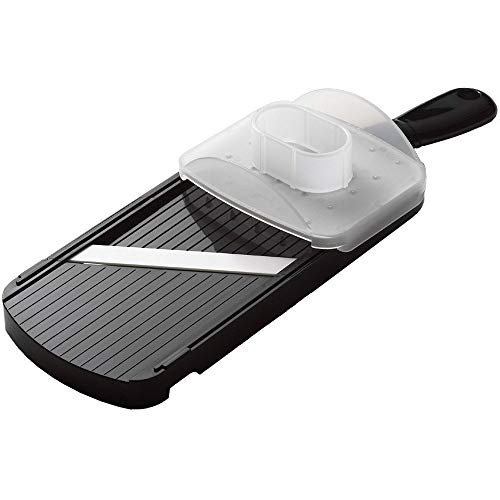 The slicer features a quick and easy key setting that allows for the adjustment of thickness, julienne mode, or safety lock mode by easily controlling a single key. It also provides better control with its nonslip handle and foot, ensuring stability over a cutting board, plate, or bowl.