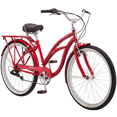 This classic curvy beach cruiser bike comes with a 13.5-inch durable steel frame and aluminum wheels that make it sturdy and reliable. The white-wall balloon tires provide a cushioned ride and give the bike a vintage look. The pedal-backwards coaster brakes make stopping easy and ensure a safe ride.
