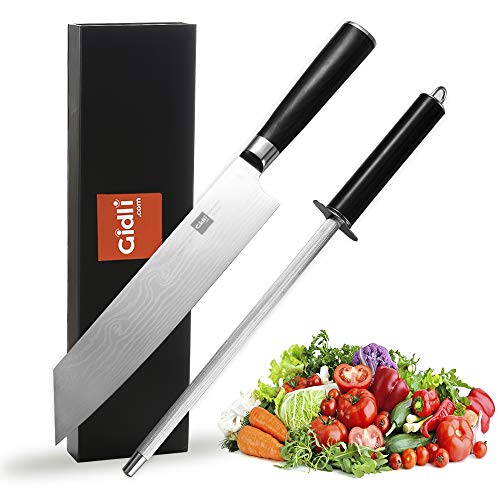 Upgrade your cooking and slicing experience with this pro sharp damascus chef knife and sharpening rod set. Don't let dull blades slow you down in the kitchen – get your hands on this knife set now and experience the power of a sharp knife!