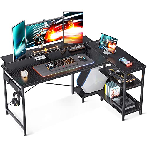 This small L-shaped desk has a modern look and is equipped with two-tier storage shelves and two headphone hooks. It can be used as a home office desk, gaming desk, corner computer desk, or writing desk, making it a versatile and practical choice for any workspace.