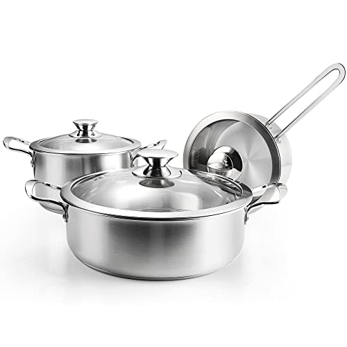 Introducing the Stainless Steel Pots and Pans Set – a perfect combination of elegance, practicality, and functionality. This set includes a 2 Qt Pot with Lid, a 2.6 Qt Pot with Lid, and a 3.7 Qt Pot with Lid, making it an ideal set for family use or as a gift option.