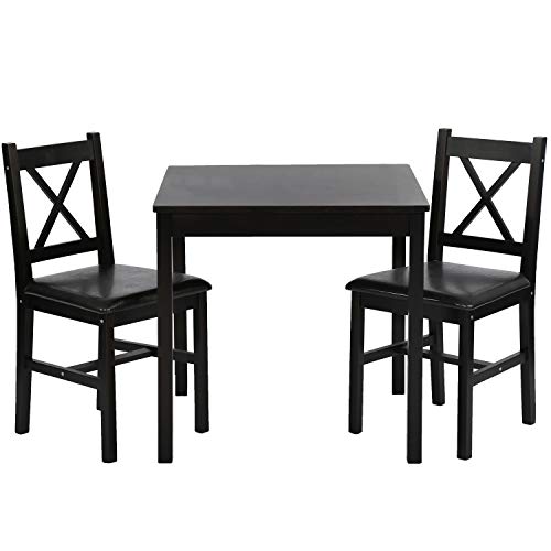 The dining table legs are connected by metal connectors, and the horizontal post in the middle of the chair feet enhances stability. Every piece of wood material is chosen carefully and handled meticulously with exquisite craftsmanship. The dining set's color looks luxurious and retro. The set includes 1 dining table and 2 upholstered dining chairs that feature contemporary faux leather upholstery. The chairs are a comfortable addition to any dining room and the wood dining set mixes a contemporary design with classic comfort, making it a great addition to your kitchen or dining room.