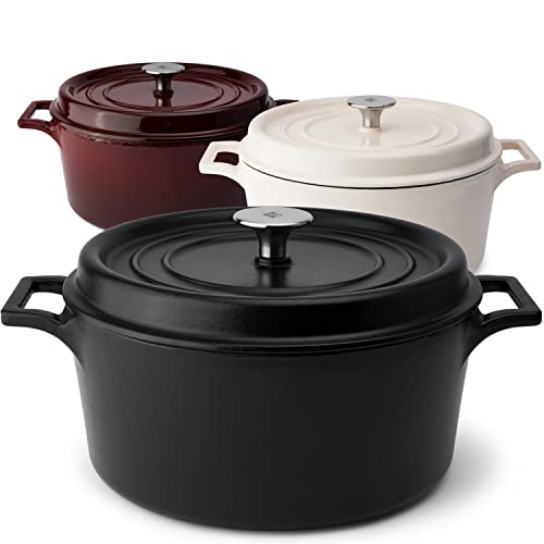 Crafted with extra durability in mind, this enameled cast iron dutch oven boasts a beautiful color and a durable black enamel interior. The enamel interior features a non-stick coating that is suitable for all cooking methods, particularly for frying, deep frying, and stir frying, when compared to the white enamel interior.
