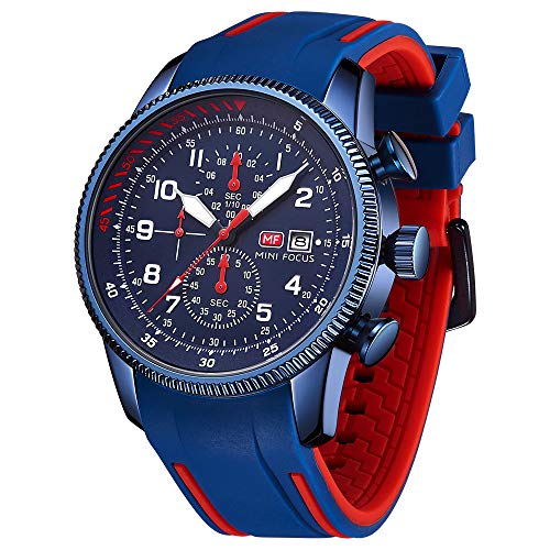 This watch boasts a precise quartz movement with a built-in chronograph and calendar date feature. The blue 47mm alloy case is 13.7mm thick and weighs in at a comfortable 100g, making it easy to wear all day long. The blue dial features a durable mineral crystal lens, luminous pointers, and Arabic hour markers, with a convenient calendar indicator located at the 3:00 position. The watch comes with a blue 24mm adjustable soft silicone band that has a pin buckle closure and can fit up to an 8-inch wrist circumference.