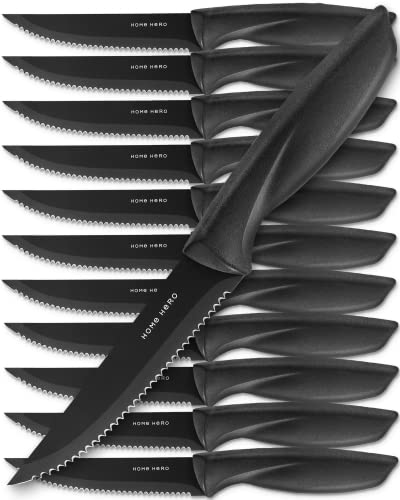 The Home Hero 12-piece steak knife set is a must-have for any culinarian looking for the perfect kitchen gadget. Made with sharp, fully serrated stainless steel blades, these knives cut effortlessly through meat and are covered in a nonstick coating to prevent food from sticking. The rust-resistant stainless steel ensures the blades remain spotless and perform at their best even after multiple washes.