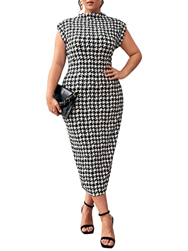 6. Women's Houndstooth Mock Neck Sleeveless Shoulder Pads Bodycon Dress