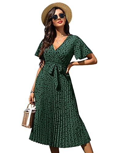8. Women's Polka Dots Short Sleeve Wrap V Neck Belted A Line Pleated Midi Dress