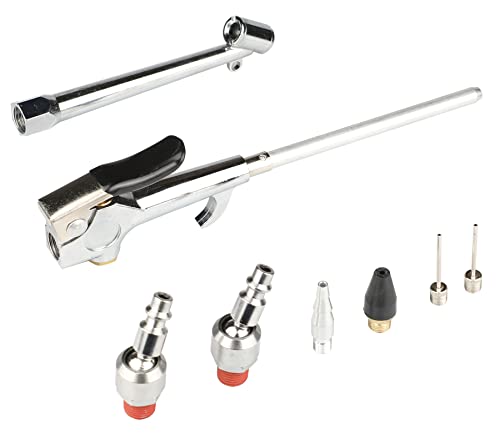 In addition to the air blow gun, this kit includes six interchangeable attachments. These attachments include a non-marring soft rubber tip, safety tip, tapered tip, inflating needle, and four 7-inch long extension tubes. With these attachments, you can easily blow away dust and debris to clean your garage floor, workbench, and other areas. You can also use them to inflate various applications, such as cars, bikes, sports balls, pool toys, and air mattresses.