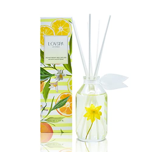 Indulge in the refreshing and invigorating scent of grapefruit, meyer lemon, mint, basil, clary sage, and jasmine flowers with the LOVSPA Fresh & Bright Scented Reed Diffuser Gift Set. This complete luxury set comes with rattan reed sticks, essential and fragrance oils, a glass bottle, and a beautiful gift box, making it a thoughtful gift idea for both men and women, including mom and dad, grandma and grandpa. It is also an excellent housewarming gift idea for new homeowners or those on a housewarming gift registry. It can be an impressive gift for co-workers, boss, employees, or office staff.