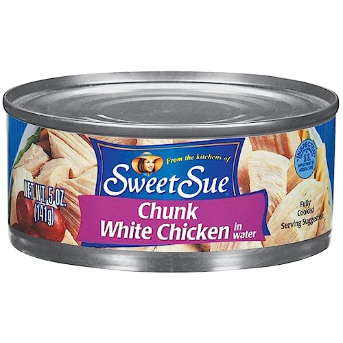 The Sweet Sue brand offers a 24-pack of 5 ounce cans filled with premium white chicken that is of the highest quality. This canned chicken makes for a tasty and healthy snack, lunch, or dinner option.