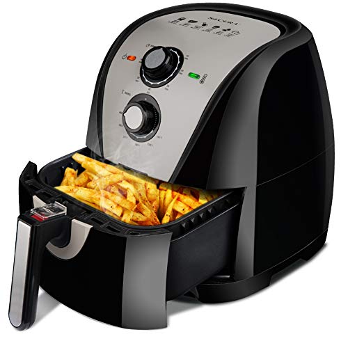 The air fryer is ideal for cooking delicious and crispy food with less oil, using a timer and temperature control.