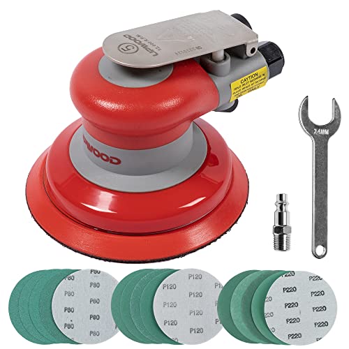 The packing includes the air sander, a 6-inch backing plate, 10 pieces of 6”-240# sandpaper, a connector, a wrench, Teflon tape, and a product manual. With its varied applications, central-vacuum design, and professional-grade quality, this air powered sander is an excellent addition to any workshop or garage.